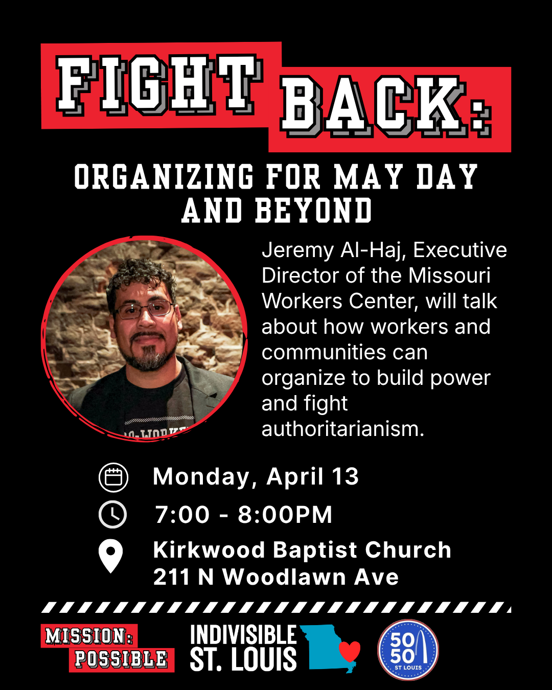 Join us at Kirkwood Baptist Church for a special training. We’ll be joined by Jeremy Al-Haj for his presentation, FIGHT BACK: Organizing for May Day and Beyond. Click here to learn more.