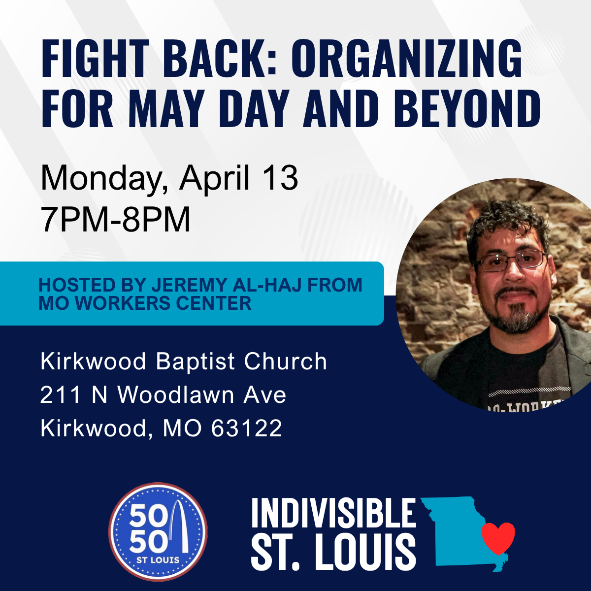 Our monthly membership meeting is Monday, April 13. We're teaming up with 50501-St. Louis to host a special training in preparation for May Day. We'll be joined by Jeremy Al-Haj from Missouri Workers Center for his presentation, FIGHT BACK: Organizing for May Day and Beyond.